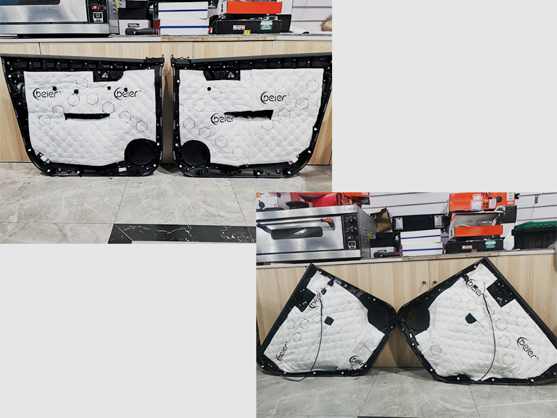 贝尔的隔音蓝膜增厚门板的厚度。从而达到减少共振和减少音质的丢失。